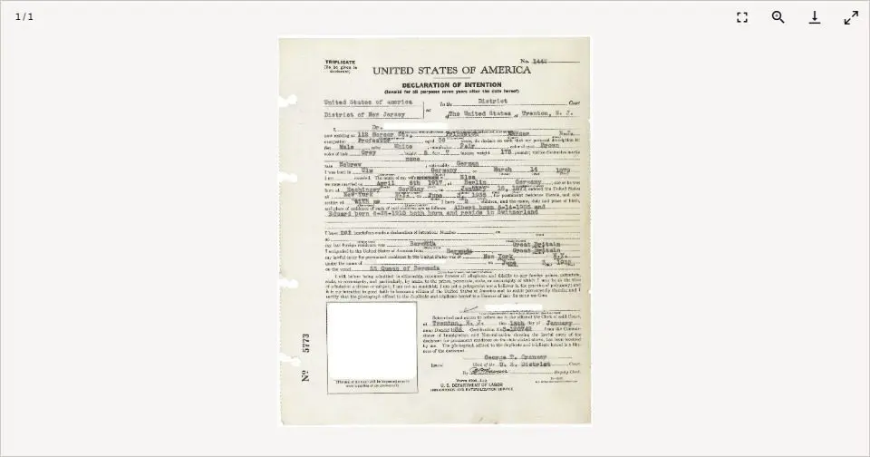 You will see a Declaration of Intention document in which a person is applying to become an American citizen. Explore the document looking for clues to uncover the identity of this famous immigrant.