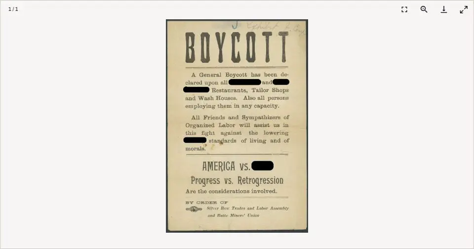 Throughout its history, when various groups of people have immigrated to the United States, it has often been met with controversy. On this broadside, the name of the immigrant group has been blacked out. Use clues from the document to determine which group it refers to. Read and analyze the following broadside using the questions below.