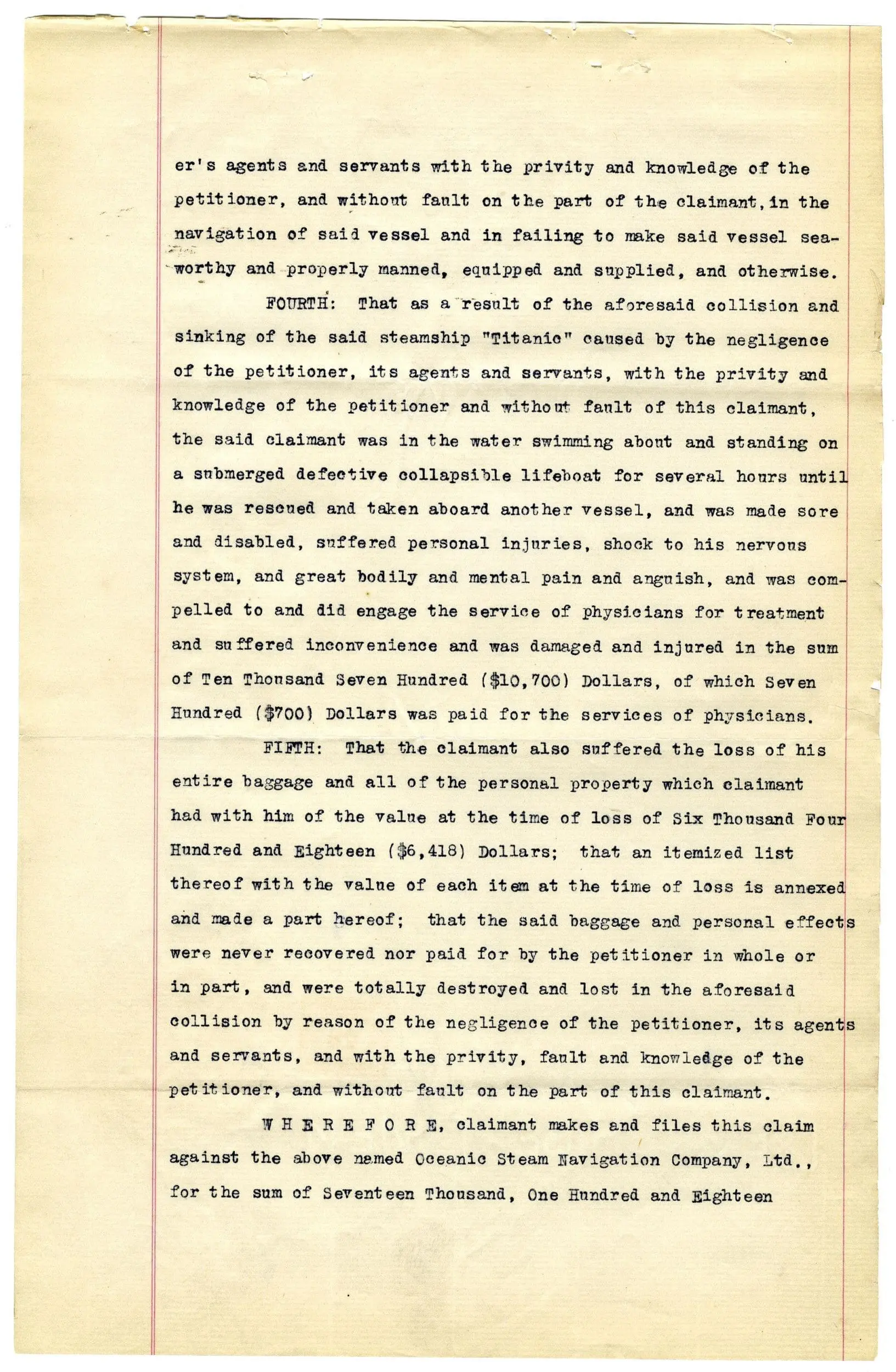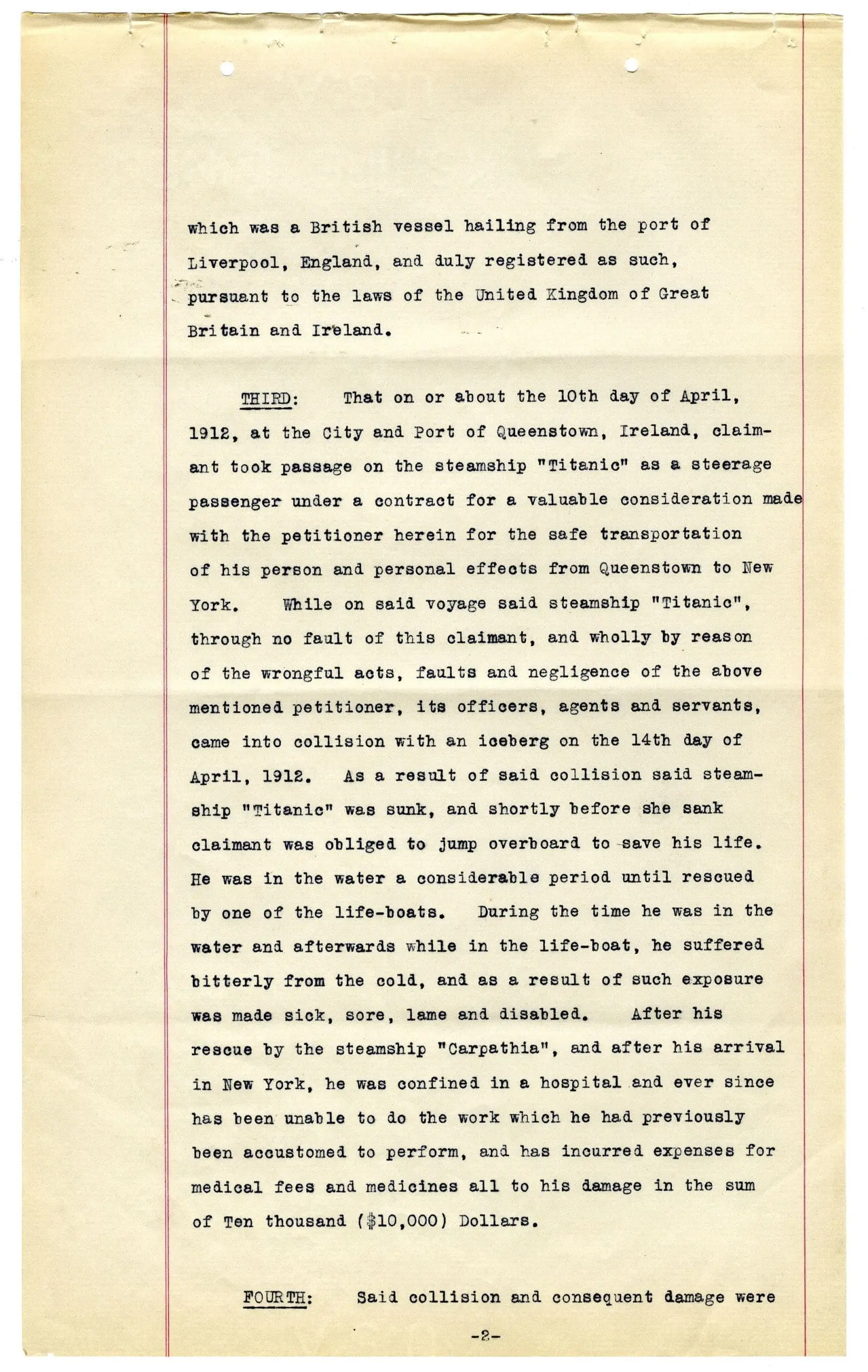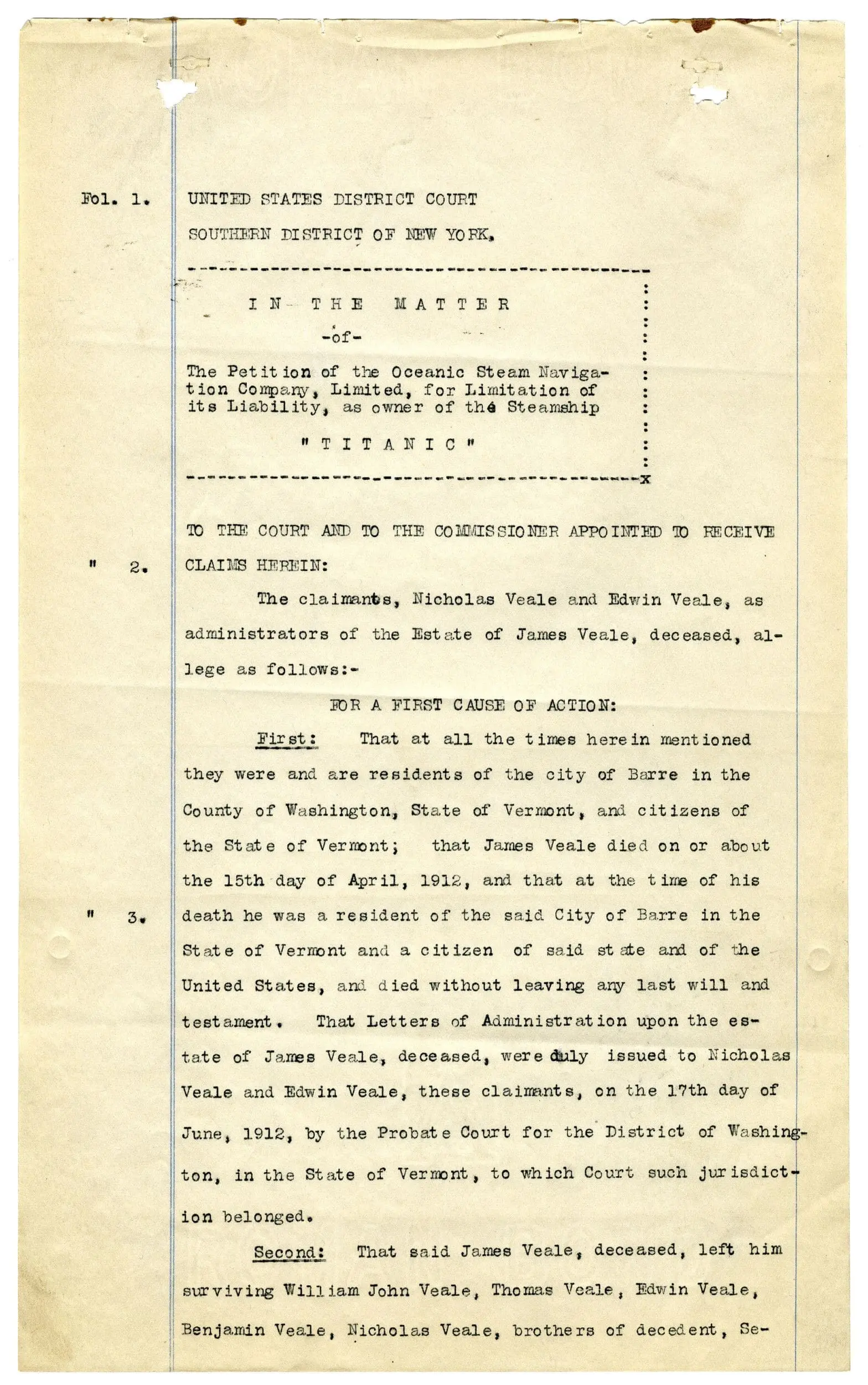 After the Titanic sank to the bottom of the Atlantic Ocean on April 15, 1912, hundreds of the survivors, families of victims, and owners of cargo filed claims against the White Star Line for loss of life, property, and for injuries sustained. Their claims totaled $16.4 million. Examine their claims to see the values of items lost, how people survived the disaster, and the social class differences aboard history’s most infamous ship.