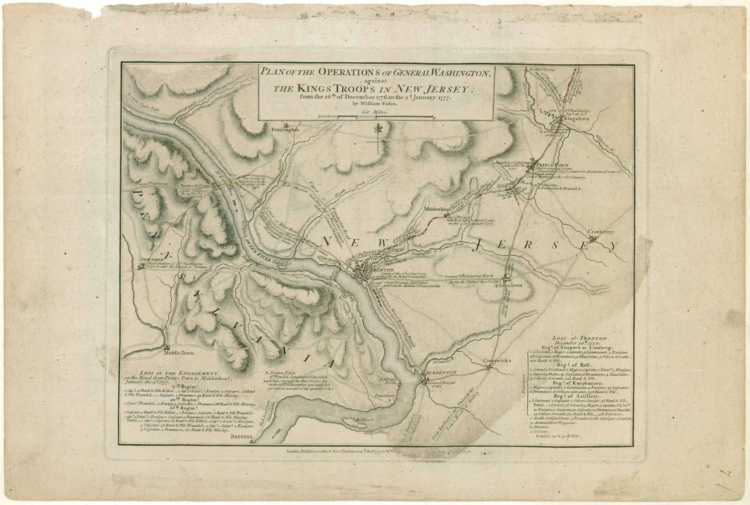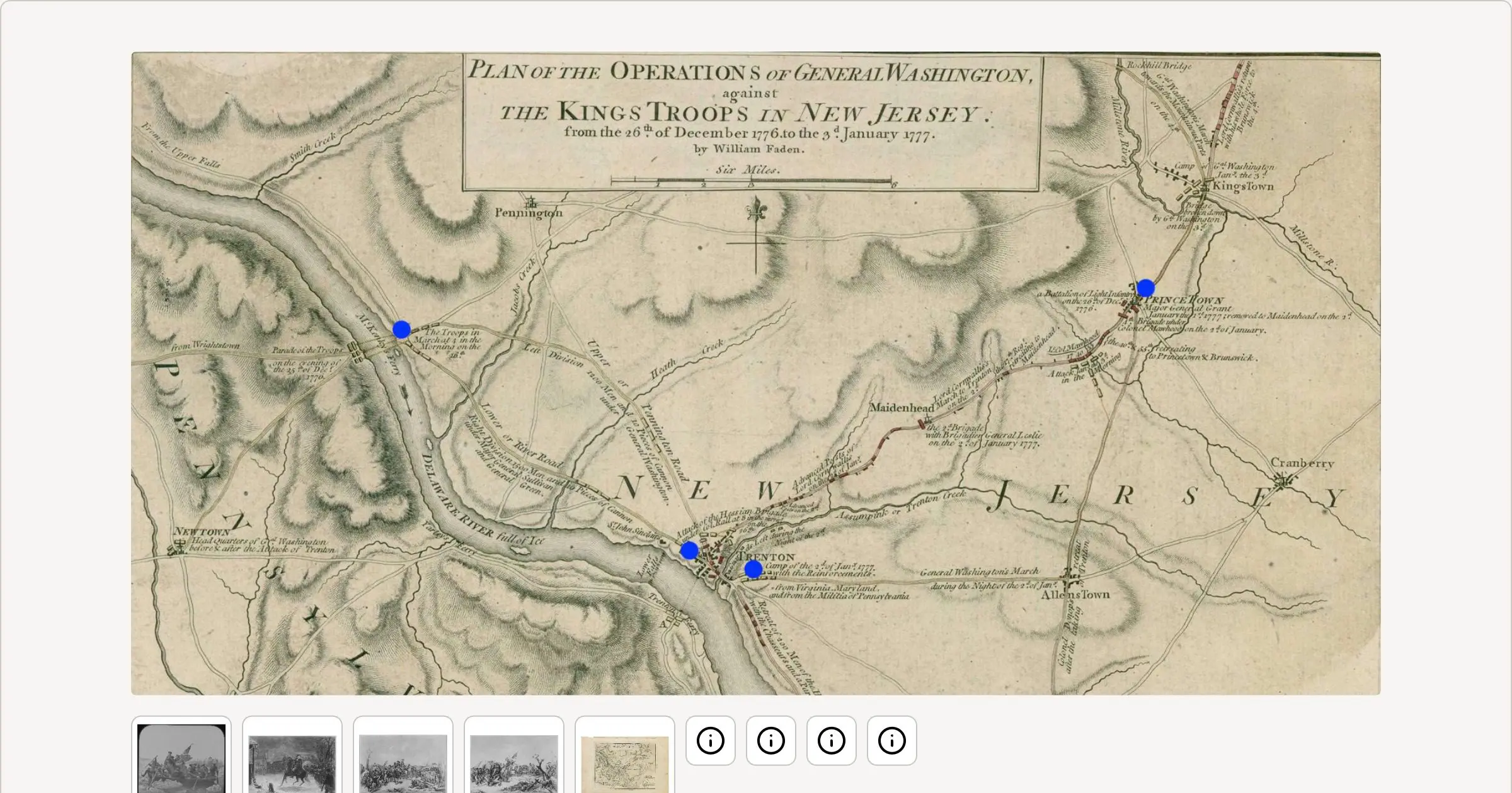 Examine and analyze the map and related images connected to George Washington’s crossing the Delaware River and the Battles of Trenton and Princeton. (Click on the orange “open in new window” icon to see each one more closely.)