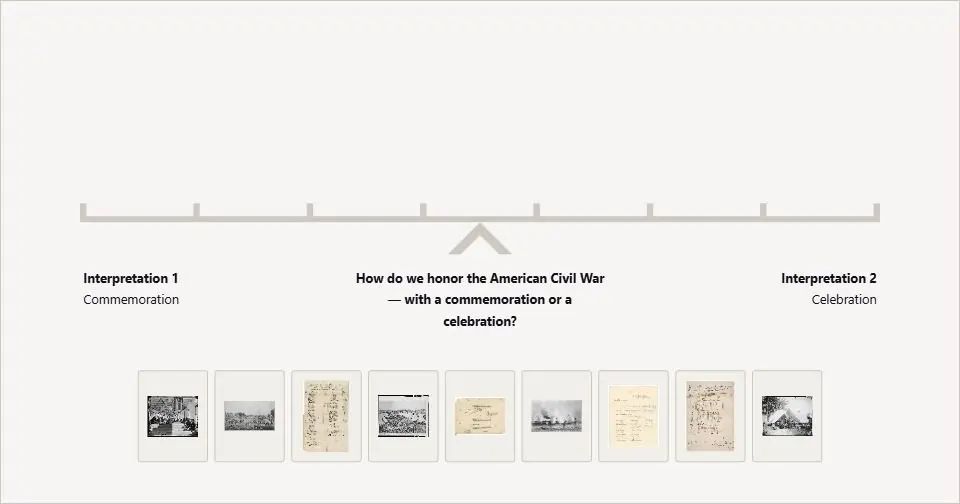 Carefully examine each document by clicking on the Details icon, then drag and place it on the scale to decide whether the evidence supports a commemoration or celebration.