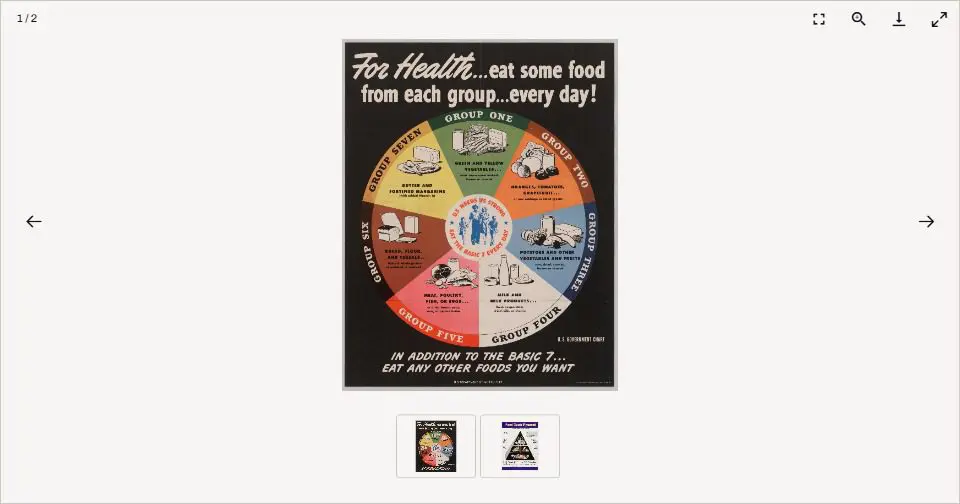 During World War II, the United States Department of Agriculture introduced a nutrition guide to help maintain nutritional standards. Over time, the government’s nutritional standards have changed. In this activity, you will closely examine two posters to determine how the government’s effect on the American diet has changed and why the change has occurred.