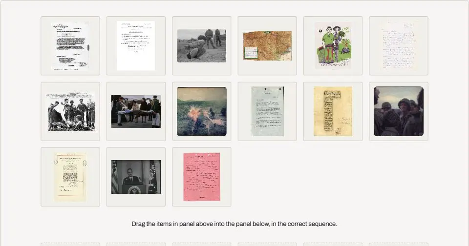 Place the primary sources provided in chronological order to create a timeline of major events of the Vietnam War. Drag each document, photograph, or video in the upper panel into a square in the lower panel.