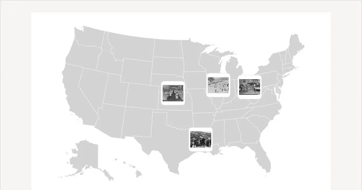 Examine each photograph to determine the New Deal program that this job was part of; then move the document pin to the state or region where you think the picture was taken. The first four have been done for you.