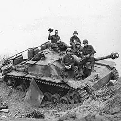 Two assault guns knocked out by 9th Air Force fighter-bombers near Modrath, Germany, to ease the advance of the 1st Army to Cologne. Infantrymen, one with a top hat picked up in a nearby town, sit on the disabled vehicle resting on the rim of the crater made by a bomb.
