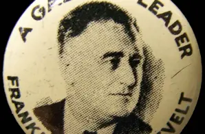 This button says “A Gallant Leader, Franklin D. Roosevelt” encircling a picture of FDR.