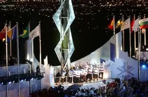 The original caption for this photograph reads: Members of the 1980 US Gold Medal Olympic hockey team stand below the Olympic flame after lighting it, at Rice-Eccles Olympic Stadium, during the opening ceremonies of the 2002 Winter Olympics in Salt Lake City.