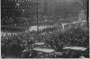 The original caption for this item is as follows: Famous New York soldiers return home. [The] 369th Infantry (old 15th National Guard of New York City) was the first New York regiment to parade as veterans of Great War. General view of parade and reviewing stand.