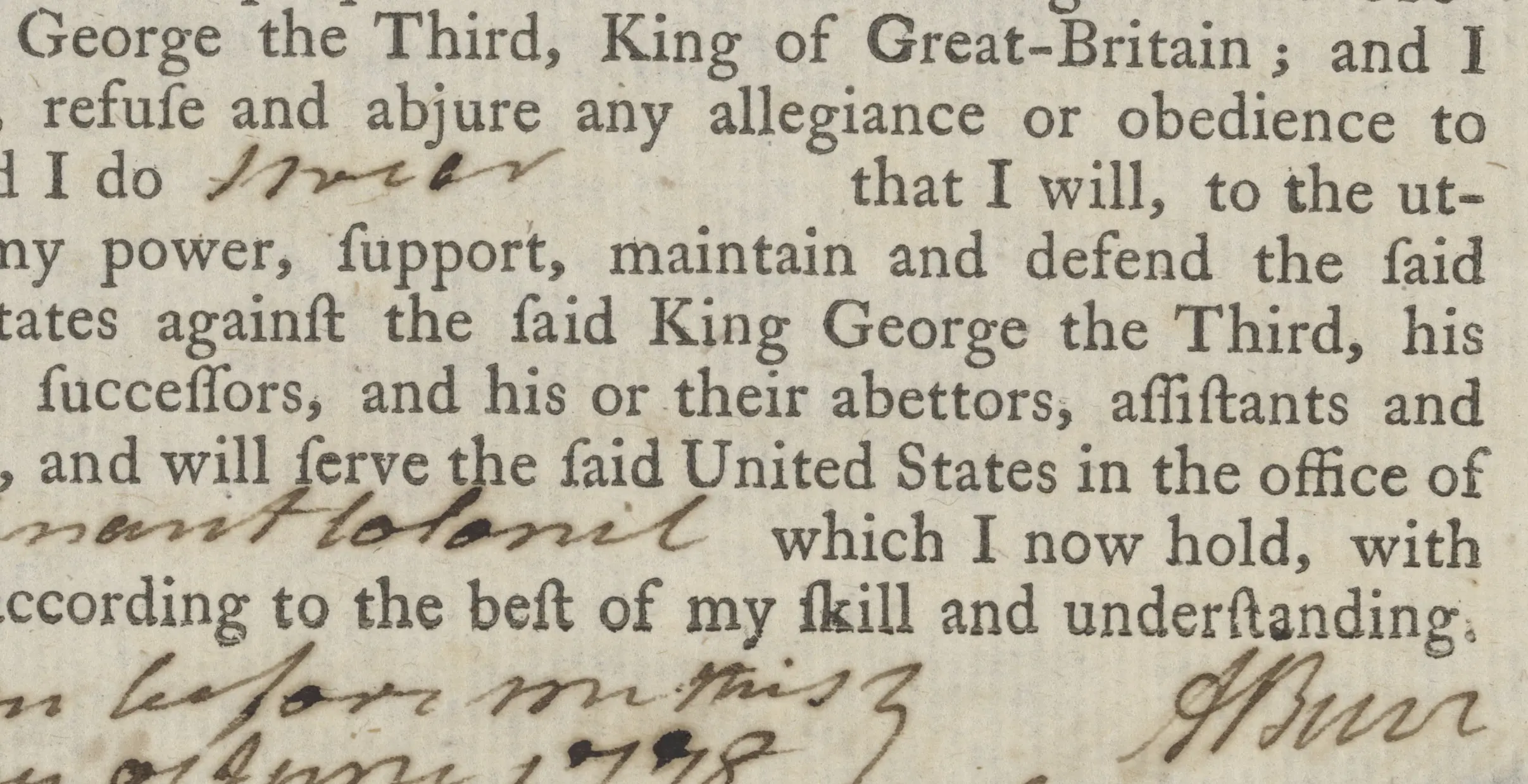 This is the Oath of Allegiance and Fidelity that was signed by Lieutenant Colonel Aaron Burr, of Malcolm’s Regiment, while stationed and encamped with the Continental Army at Valley Forge, Pennsylvania. This affirmation came to be taken due to a Congressional Resolve dated February 3, 1778, that directed “every officer who holds or shall hereafter hold a commission or office from Congress” to take this oath.
