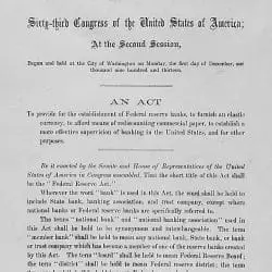Full Citation: Act of December 23, 1913 (Federal Reserve Banks Act), Public Law 63-43, 38 STAT 251, which established Federal reserve banks to furnish an elastic currency, to afford means of rediscounting commercial; 12/23/1913; General Records of the United States Government, Record Group 11. [Online Version, https://docsteach.org/document/act-december-23-1913-federal-reserve-banks-act/, April 2, 2026]