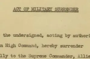 This instrument of surrender, the unconditional surrender of the German Third Reich, was signed in the early morning hours of May 7, 1945, at General Dwight D. Eisenhower’s headquarters in Reims, in northeastern France. It was signed by General Alfred Jodl, Chief of Staff of the German Army. At the same time, he signed three other surrender documents, one each for Great Britain, Russia, and France.