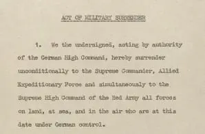 The document seen here is the unconditional surrender of all German Forces to the Allied Expeditionary Force and the Supreme Allied Command of the Red Army, in which all German military operations would cease on May 8, 1945 at 2301 hours.