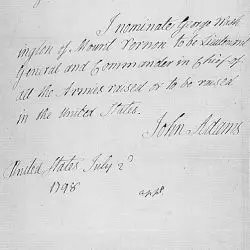 Full Citation: Message of President John Adams nominating George Washington to be Lieutenant General and Commander in Chief of the Armies raised or to be raised in the United States; 7/2/1798; Anson McCook Collection of Presidential Signatures, 1789 – 1975; Records of the U.S. Senate, Record Group 46; National Archives Building, Washington, DC. [Online Version, https://docsteach.org/document/adams-nomination-washington/, April 6, 2026]