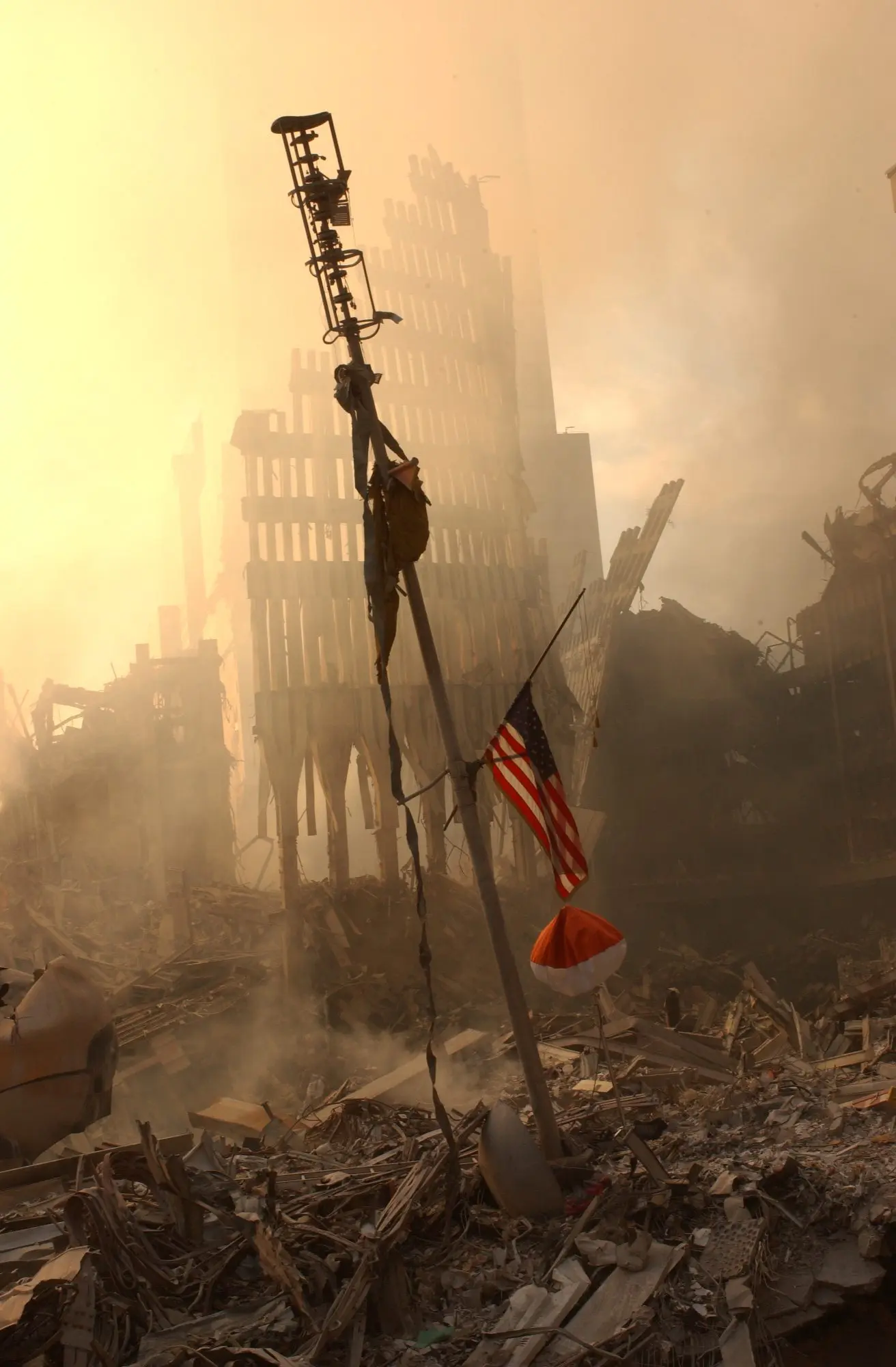 A U.S. flag flies from a television antenna on September 13, 2001, amid the rubble of the World Trade Center after an airplane crashed into it on September 11 as part of the terrorist attack.
