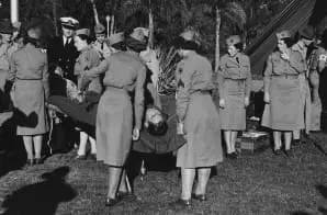 This photograph taken in San Diego, California, shows women in the Women’s Ambulance-Transport Corps practicing handling casualties in the presence of a naval officer and Marine Corps drill instructors.