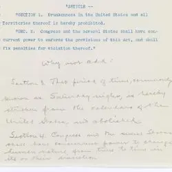 Some people couldn’t let it go, even five years after the repeal of Prohibition by the 21st Amendment. But instead of prohibiting alcohol sales, this amendment proposed to regulate personal behavior by prohibiting drunkenness. The absurdity of this was cheekily pointed out in the handwritten note at the bottom, which proposed adding an equally far-fetched effort to abolish Saturday nights. Transcription of handwritten note Why not add: Section 3. That period of time, commonly known as Saturday night, is hereby stricken from the calendar of the United States, and abolished. Section 4. Congress and the several States shall have concurrent power to change human nature from time to time in its or their discretion.