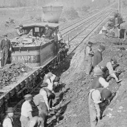 Full Citation: Aquia Creek and Fredericksburg Railroad, construction corps at work, VA; ca. 1860 – 1865; Mathew Brady Photographs of Civil War-Era Personalities and Scenes, 1921 – 1940; Records of the Office of the Chief Signal Officer, Record Group 111. [Online Version, https://docsteach.org/document/aquia-creek-and-fredericksburg-railroad-construction-corps-at-work-va/, February 21, 2026]