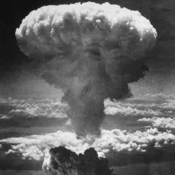 Original caption: A dense column of smoke rises more than 60,000 feet into the air over the Japanese port of Nagasaki, the result of an atomic bomb, the second ever used in warfare, dropped on the industrial center August 8, 1945, from a U.S. B-29 Superfortress.