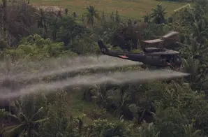 The original caption for this photograph reads: Vietnam. Defoliation Mission. A UH-1D helicopter from the 336th Aviation Company sprays a defoliation agent on a dense jungle area in the Mekong delta.