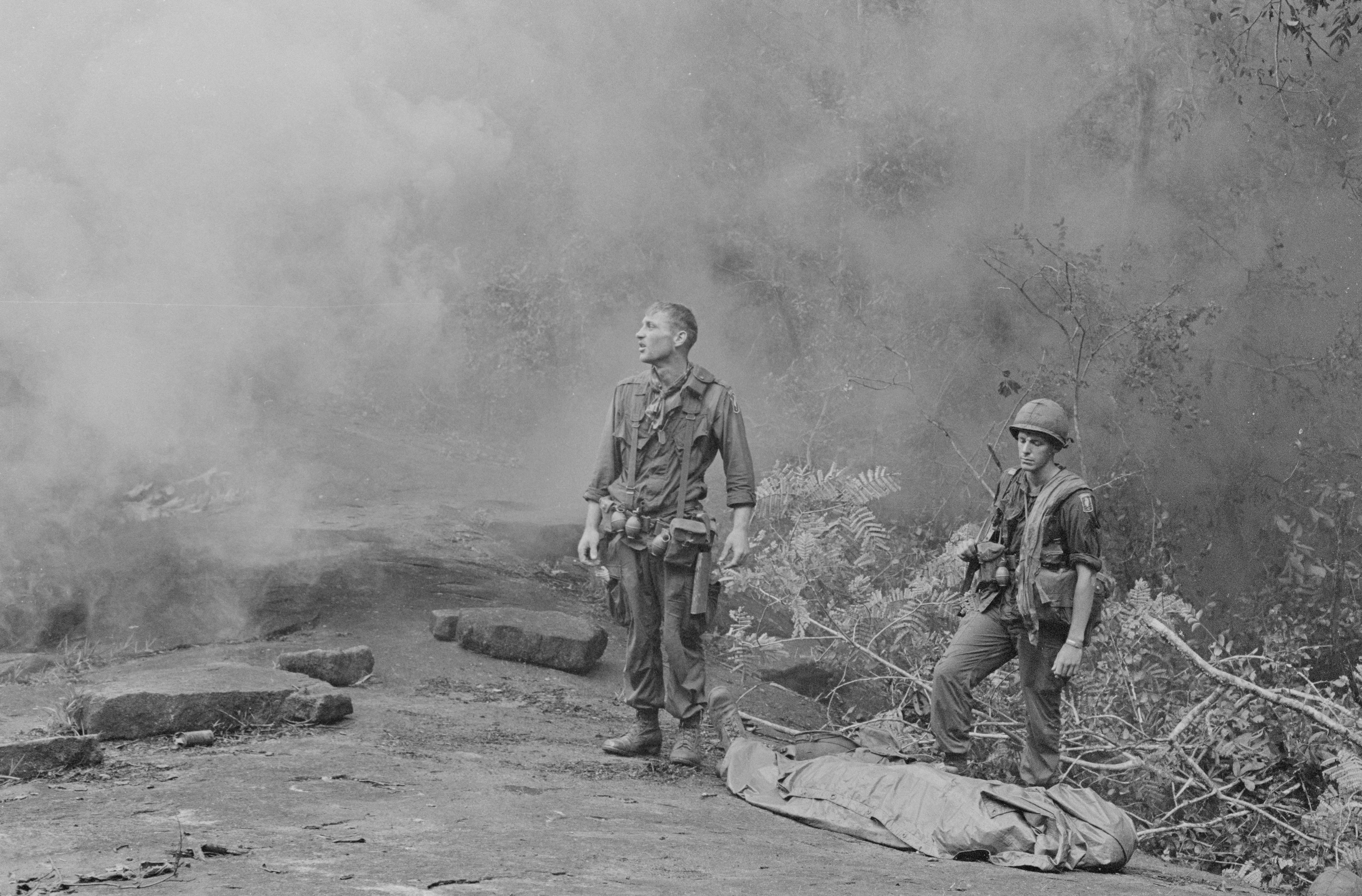 The original caption for this photograph reads: Long Khanh Province, Republic of Vietnam….SP4 R. Richter, 4th Battalion, 503rd Infantry, 173rd Airborne Brigade, lifts his battle weary eyes to the heavens, as if to ask why? Sergeant Daniel E. Spencer stares down at their fallen comrade. The day’s battle ended, the silently await the helicopter which will evacuate their comrade from the jungle covered hills.