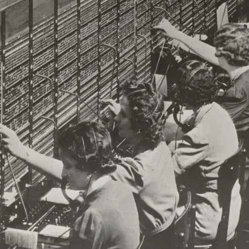 Full Citation: Photograph 86-WWT-28-3; Photograph of Women Working at a Bell System Telephone Switchboard; 12/22/1943; Women Working In Industry, 1940 – 1945; Records of the Women’s Bureau, Record Group 86; National Archives at College Park, College Park, MD. [Online Version, https://docsteach.org/document/bell-telephone-switchboard/, April 4, 2026]