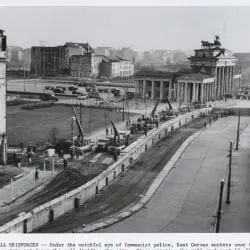 Original caption: Berlin wall reinforced. Under the watchful eye of Communist police, East german workers near the Brandenburg Gate reinforce the wall dividing the city. Since erecting the wall on August 13, 1961, to stop the flow of East Germans into West Berlin, the East German Communists have added bunkers, spotlights and firing and observation posts. Photo from IPS. 61-12996. Accompanies Z-1/71-SM-49