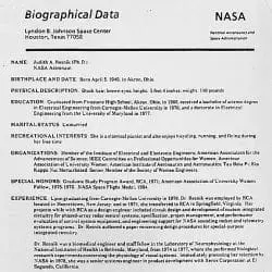 A NASA fact sheet giving basic information on Judith A. Resnick, one of the astronauts killed in the January 1986 space shuttle Challenger explosion.