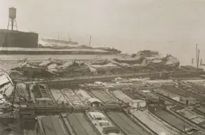 This photograph shows the aftermath of explosions at the Black Tom railroad yard during World War I. In 1916, before the United States formally entered the war, German agents blew up train cars at the yard that were packed with war materials to ship to Great Britain.