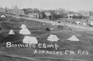 These people were waiting in Kansas prior to the Land Run of 1893, also known as the Cherokee Strip Land Run or Cherokee Outlet Opening.
