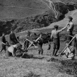 Digging trenches. The earth was carried away on the wire cable so as not to reveal the position by its colour. This comes from a series of photographs acquired by the War Department depicting the military activities and personnel of several nations during World War I, 1914-1918.
