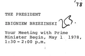 National Security Adviser Zbigniew Brzezinski sent this memo to President Carter in advance of Carter’s meeting with Israeli Prime Minister Menachem Begin on May 1, 1978. Brzezinski asserted that a renewed commitment to Israeli security should be coupled with an appeal for Begin’s recognition of the requirements that Egyptian President Anwar Sadat had asserted during in the Middle East peace process.