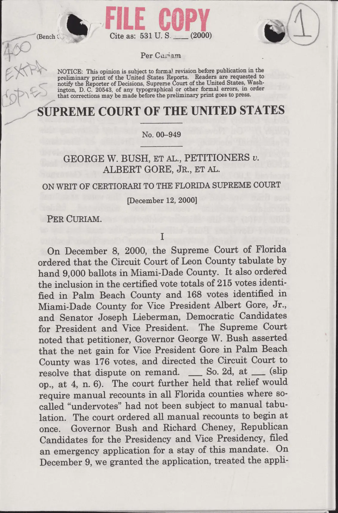 On December 12, 2000, the Supreme Court ended a Florida vote recount in the presidential election contest between George W. Bush and Al Gore. This court case ended the ballot recount in Florida and determined the 2000 Presidential election in favor of George W. Bush.