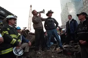 The original caption for this photograph reads: Standing atop rubble with retired New York City firefighter Bob Beckwith, President George W. Bush rallies firefighters and rescue workers during an impromptu speech at the site of the collapsed World Trade Center in New York City.
