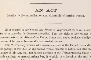 Congress passed this citizenship act in 1922. It was introduced by Representative John L. Cable, a Republican from Ohio, to provide American married women “equal nationality and citizen rights” as men. In part, the Act guaranteed that the right of any women to become a naturalized citizen of the United States shall not be denied because of her sex. With this Act, American women who married foreign citizens were no longer expatriated (required to take the nationality of their husbands) unless they married “an alien ineligible for citizenship,” as per the exclusionary racial politics of the time.