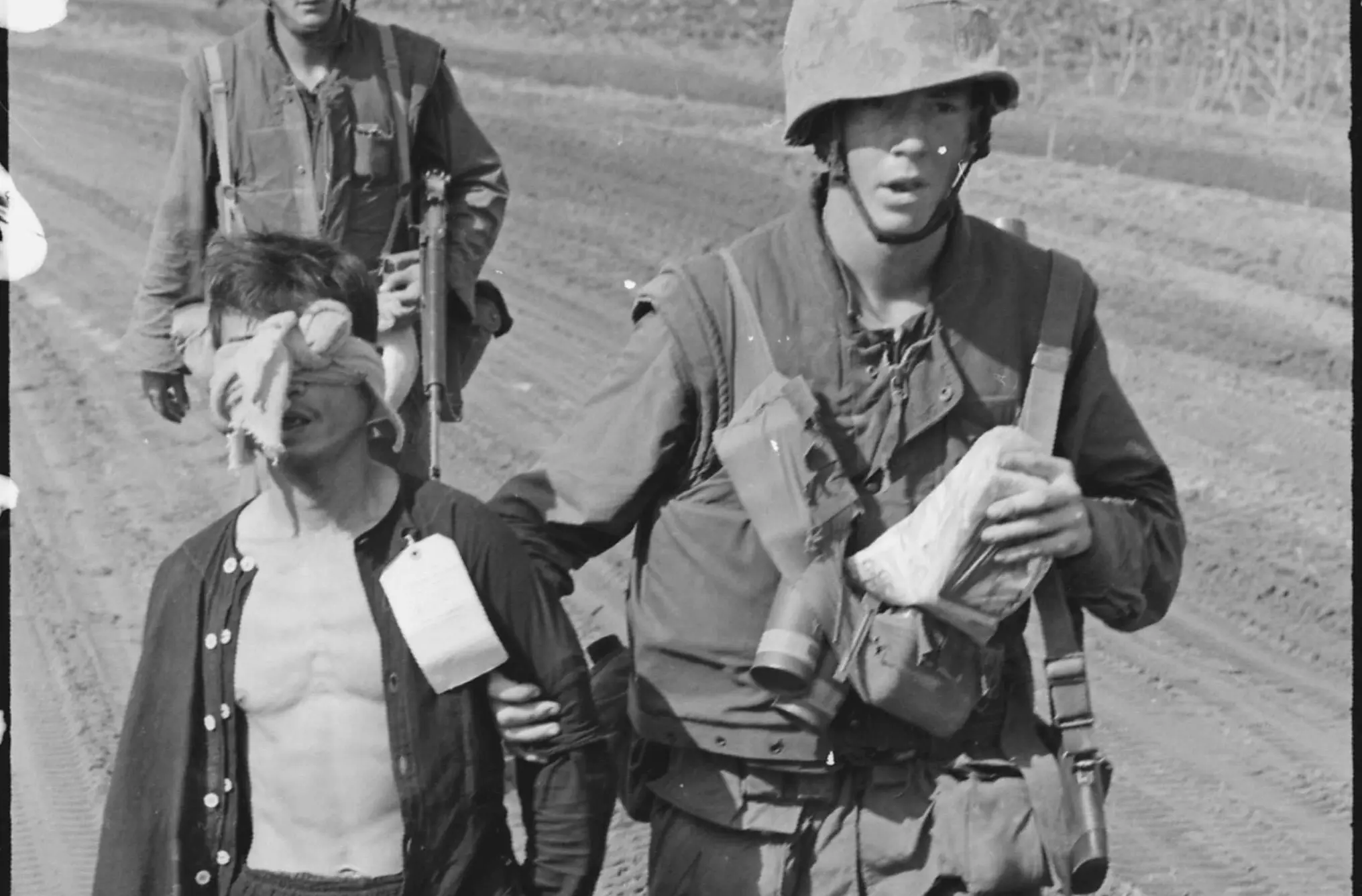 A Viet Cong prisoner captured during Operation Double Eagle, 20 miles south of Quang Ngai, Vietnam is brought into the collection area by Marines. Prisoners are blindfolded and tied to prevent escape attempts. The card on the prisoner’s black pajama shirt relates to circumstances of his capture.