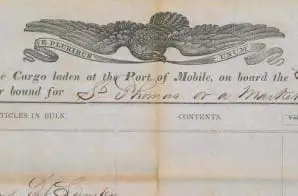 On February 27, 1860, the schooner Clotilda, commanded by Captain William Foster, departed Mobile, AL, for what this document describes as “St. Thomas or a market.” Actually, the vessel sailed to the coast of West Africa where it loaded a cargo of 103 captives for transport back to the Mobile area. The ship entered Mobile Bay in early July 1860, carrying its human cargo, fifty-two years after the United States legally abolished the international slave trade. Criminal charges were leveled against the illegal voyage’s organizers and the Clotilda became the last known slave ship to arrive in the United States.