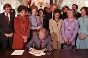This photograph shows President Jimmy Carter signing the House of Representative resolution proposing the Equal Rights Amendment (ERA) before it was sent to the states for ratification in 1978. The Equal Rights Amendment was supported by those who believed that women did not have equal status to men in the United States and who hoped to force change. The ERA failed to gain ratification by the required number of states and therefore was not made into law.