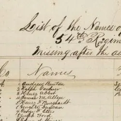 This list includes all the enlisted men of the 54th Massachusetts Infantry Regiment missing—and presumed dead—after the assault on Fort Wagner. The total loss was 5 sergeants, 9 corporals, and 86 privates.