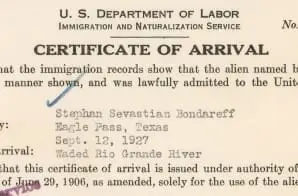 On September 12, 1927, fearing he would not be allowed to enter the United States since he had no visa, Bondareff “Waded Rio Grande River” at Eagle Pass, Texas. He later settled in Dearborn, Michigan, and worked for the Ford Motor Company.