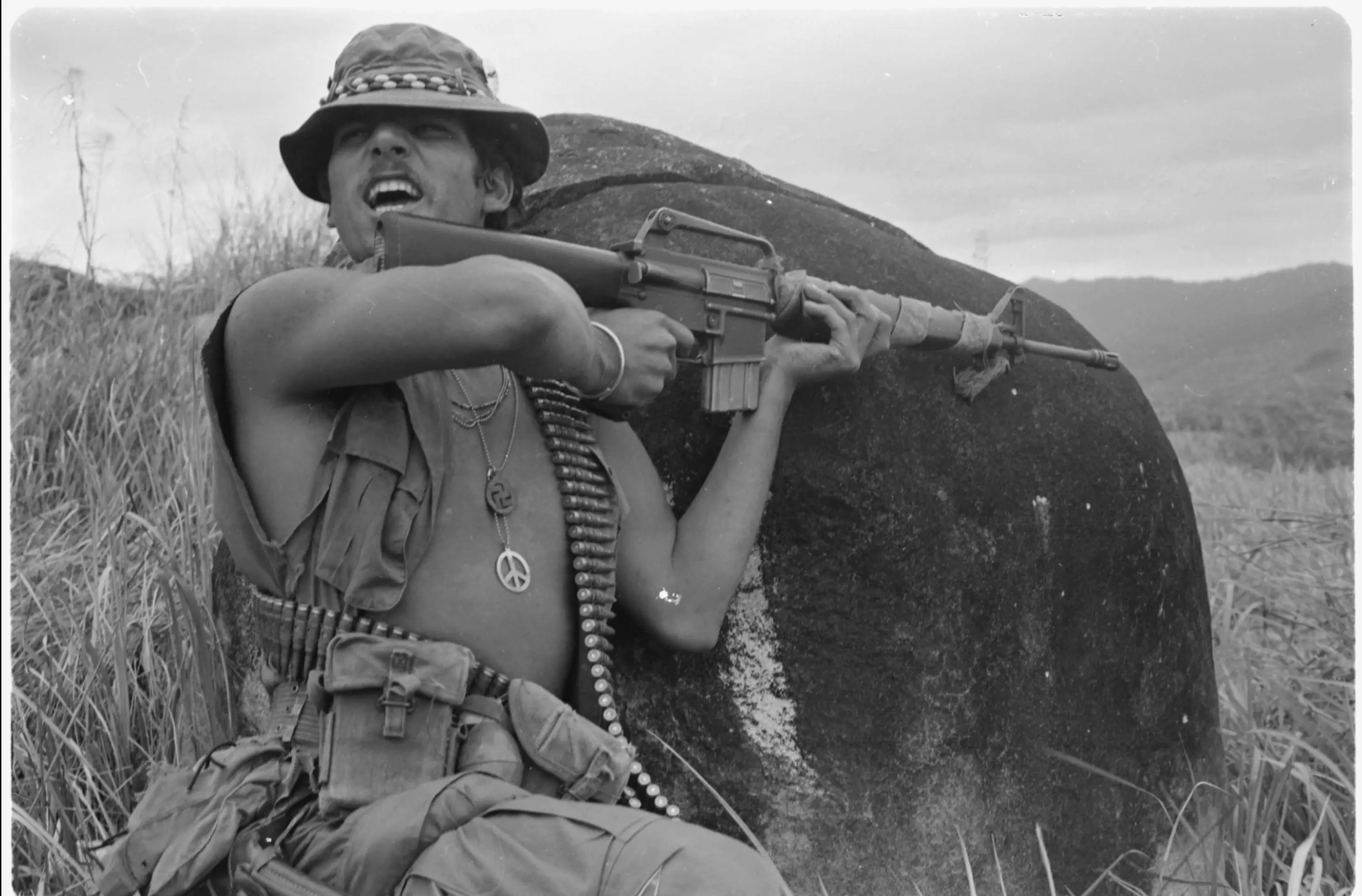 The original caption for this photograph reads: Vietnam….Specialist. 4 Richard Champion, squad leader, Company B, 4th Battalion, 21st Infantry, 11th Light Infantry Brigade, shouts instructions to his squad after receiving sniper fire while on patrol on Hill 56, 70 miles southeast of Chu Lai.