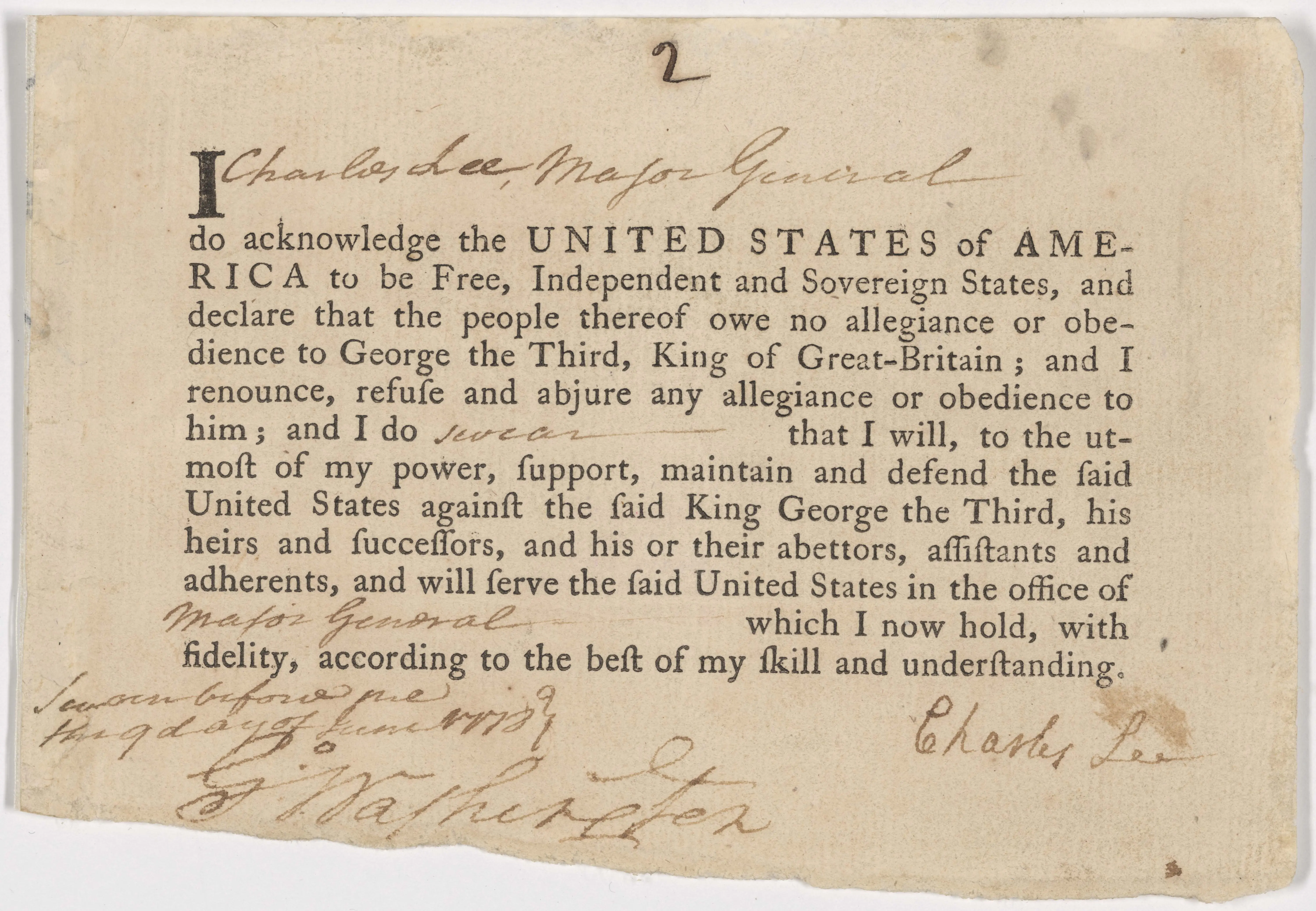 This is the Oath of Allegiance and Fidelity that was signed by Major General Charles Lee while stationed and encamped with the Continental Army at Valley Forge, Pennsylvania. His oath was sworn before, and also signed by, George Washington, General and Commander in Chief of the Continental Army.