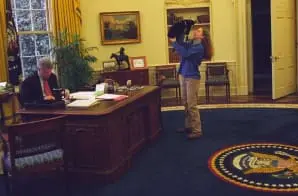This photograph shows Chelsea Clinton playing with Socks the Cat in the Oval Office while President William Jefferson Clinton works at his desk.
