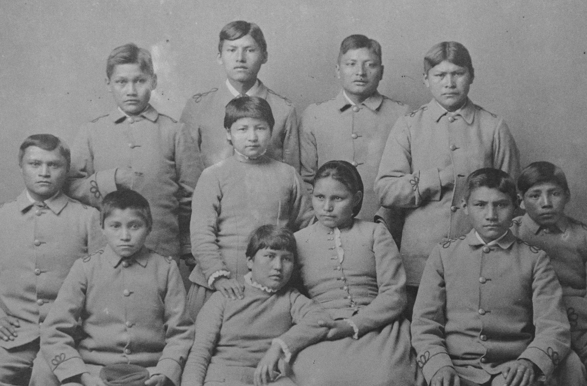 These Chiricahua Apache students were photographed at the Carlisle Indian School, near Harrisburg, Pennsylvania, four months after their arrival. At Carlisle and other schools, Native American students were required to abandon traditional ways and learn a trade. Richard Henry Pratt, a former Army officer, founded this military-style school in 1879 to train American Indians to become leaders upon returning to their reservations.