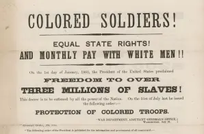 This recruiting poster was directed at black men during the Civil War. It includes information on protection of “colored troops” and refers to efforts by the Lincoln administration to provide equal pay for black soldiers and equal protection for black POWs.