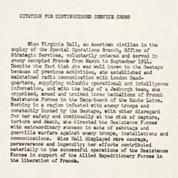 Full Citation: Citation for Virginia Hall for the Distinguished Service Cross; 1945; Personnel Files of the Office of Strategic Services, 1942–ca. 1962; Records of the Office of Strategic Services, Record Group 226; National Archives at College Park, College Park, MD. [Online Version, https://docsteach.org/document/citation-for-virginia-hall-for-the-distinguished-service-cross/, March 30, 2026]