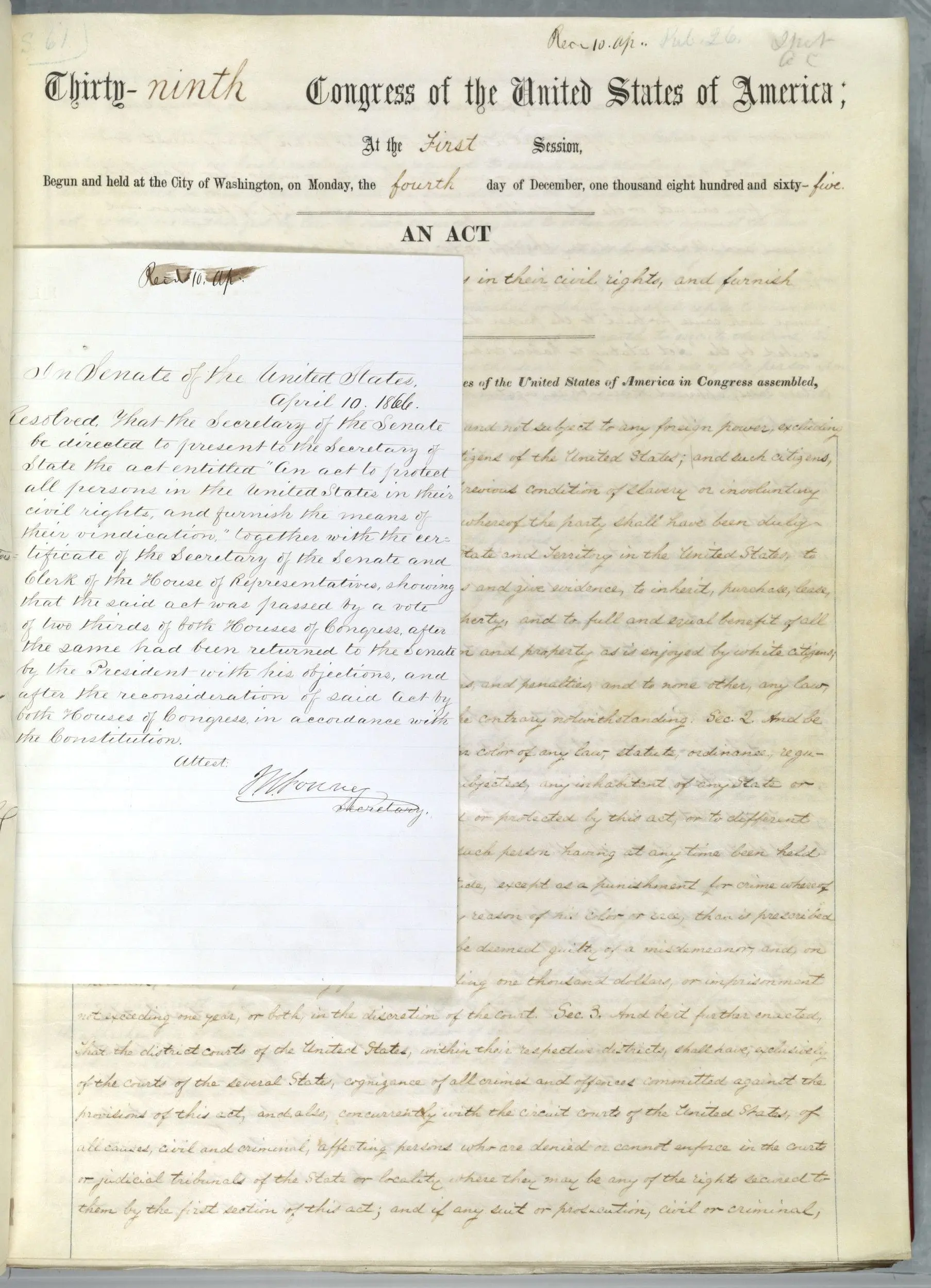 Be it enacted by the Senate and House of Representatives of the United States of America in Congress assembled, That [end typeset] [remainder of document handwritten] all persons in the United States and not subject to any foreign power, excluding Indians not taxed, are hereby declared to be citizens of the United States; and such citizens, of every race and color, without regard to any previous condition of slavery or involuntary servitude, except as a punishment for crime whereof the party shall have been duly convicted, shall have the same right, in every State and Territory in the United States, to make and enforce contracts, to sue, be parties and give evidence, to inherit, purchase, lease, sell, hold, and convey real and personal property, and to full and equal benefit of all laws and proceedings for the security of person and property as is enjoyed by white citizens; and shall be subject to like punishment, pains, and penalties, and to none others any law, statute, ordinance, regulation, or custom, to the contrary notwithstanding.