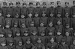 This is one of a small collection of photographs of the Albuquerque Indian School, which was established in 1881 to provide off-reservation industrial training to the Indians of the Southwest. By 1912, the school had 8 primary grades and over 300 students; by 1925 enrollment increased to over 800 students and grades 11 and 12 were added. The Albuquerque Indian School continued operating until 1982, when its program was transferred to the Santa Fe Indian School.