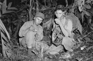 This photograph shows Navajo “code talkers” Corporal Henry Bahe, Jr., and Private First Class George H. Kirk operating a radio set. The U.S. Marines used Navajos to transmit and receive messages in their native language during World War II. Because the Navajo language is a complex, unwritten language that has no alphabet or symbols, it was a perfect candidate for coded communication. The Japanese never broke the code.