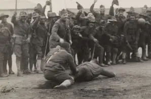 The original caption for this photograph reads: Athletic Meet, St. Nazaire, France. 369th Regiment Infantry formerly the 15th Colored Infantry of New York engage in field sports and games; Colonel William Hayward of the 15th Infantry deciding a close play at the plate in baseball contest between members of the 15th Infantry.