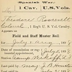 This item documents the military service of Theodore Roosevelt as an officer with the 1st United States Volunteer Cavalry Regiment (Rough Riders), during the Spanish-American War.